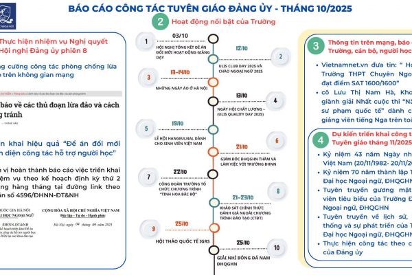 Thực hiện chỉ đạo của Thành ủy Hà Nội, trong hai ngày 30 – 31/10/2025, Đảng ủy Đại học Quốc gia Hà Nội đã tổ chức Khóa bồi dưỡng kiến thức lý luận chính trị dành cho đội ngũ giảng viên, giáo viên giảng dạy