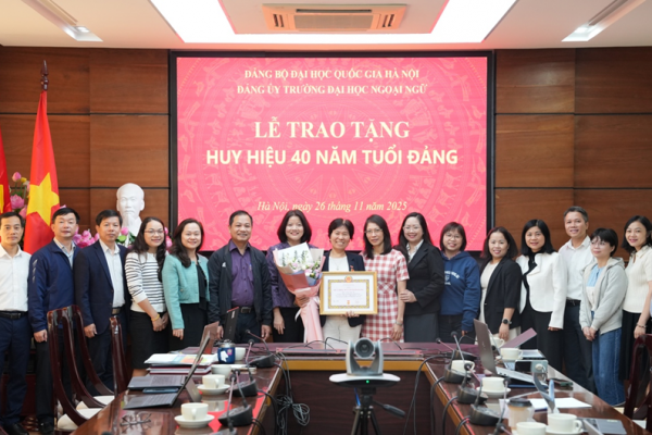 Trong không khí trang trọng của Lễ trao tặng Huy hiệu Đảng ngày 26/11/2025, Đảng bộ Trường Đại học Ngoại ngữ, ĐHQGHN đã vinh dự chúc mừng đồng chí Lê Tuyết Nga, đảng viên Chi bộ Khoa Ngôn ngữ và Văn hóa Đức đã được