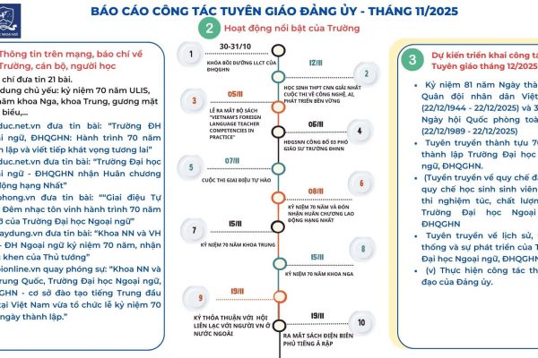 Ngày 29 tháng 10 năm 2025, Ban Chấp hành Đảng bộ Trường Đại học Ngoại ngữ, Đại học Quốc gia Hà Nội (ĐHQGHN) khóa XX, nhiệm kỳ 2025-2030 đã tổ chức Hội nghị lần thứ chín với sự tham gia của các đồng chí Đảng