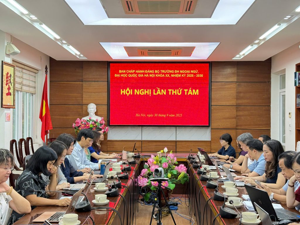 Ngày 30 tháng 9 năm 2025, Ban Chấp hành Đảng bộ Trường Đại học Ngoại ngữ, Đại học Quốc Gia Hà Nội (ĐHQGHN) khóa XX, nhiệm kỳ 2025-2030 đã tổ chức Hội nghị lần thứ 8 với sự tham gia của các đồng chì Đảng ủy viên, Bí thư Đoàn Thanh niên, các đồng chí khách mời: các đồng chí khách mời tham dự gồm: Trần Thị Thu Hiền, Bí thư Chi bộ Khoa Giáo dục quốc tế; Trần Hữu Trí, Bí thư Chi bộ Khoa Ngôn ngữ – Văn hóa Việt Nam và Đông Nam Á; Nguyễn Thị Ngọc Anh, Bí thư Đoàn TNCS Hồ Chí Minh; Nguyễn Lân Trung, Chủ tịch mạng lưới Cựu học sinh sinh viên Trường. Đồng chí Đỗ Tuấn Minh – Bí thư Đảng ủy chủ trì hội nghị.